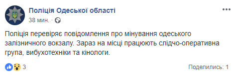 "Полиция проверяет сообщение о минировании одесского железнодорожного вокзала. Сейчас на месте работают следственно-оперативная группа, взрывотехники и кинологи", – говорится в сообщении.