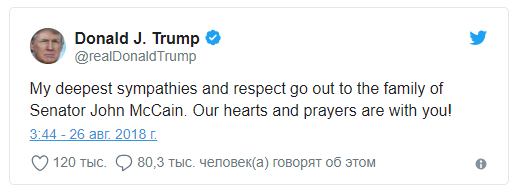 "Мои глубочайшие соболезнования и уважение семье сенатор Джона Маккейна. Наши сердца и молитвы с вами!" – написал глава Белого дома в Twitter.
