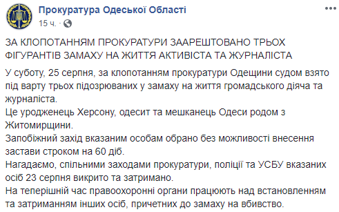 В Одессе суд взял под стражу подозреваемых в покушении на жизнь лидеров одесской организации "Народного руха Украины". Об этом сообщает прокуратура Одесской области в Facebook.