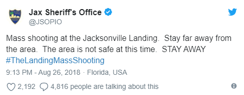 "Массовая стрельба в Джексонвилле. Держитесь подальше. Там сейчас небезопасно", - говорится в сообщении.