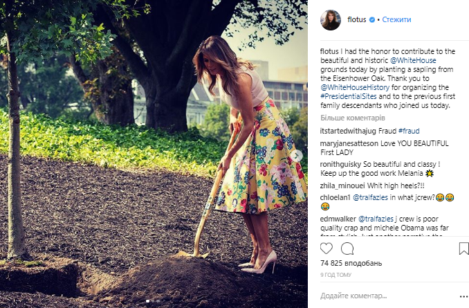 "Президенты и первые леди по традиции сажают деревья на лужайках Белого дома. Конкретно это дерево является саженцем дуба Эйзенхауэра, который растет около сада (Жаклин) Кеннеди", - говорится в сообщении пресс-службы Белого дома. Фото посадки дерева появилось на странице первой леди в соцсети. На нем видно, как Мелания в туфлях на высоких каблуках самоотверженно держит лопату и пытается набрать в нее землю.