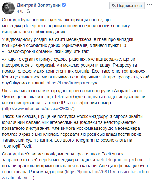 Заместитель министра информационной политики Украины Дмитрий Золотухин заявил на своей странице в Facebook, что ФСБ эффективно использует Telegram в своих спецоперациях после того, как Telegram согласился выдать данные потенциальных террористов спецслужбам.