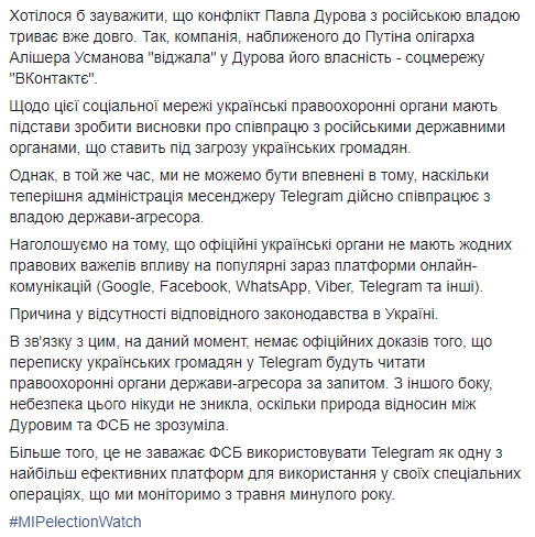 Золотухин отметил, что украинская власть не имеет никаких правовых рычагов воздействия на популярные платформы онлайн-коммуникаций, такие как Google, Facebook, WhatsApp, Viber, Telegram и другие.