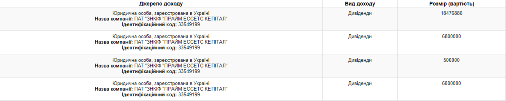 Так, президент задекларировал 31 млн 777 тысяч гривен дивидендов от фонда "Прайм Эссетс Кэпитал".
