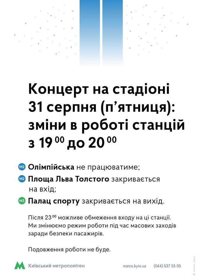 Вечером пятницы, 31 августа, Киевский метрополитен ограничит работу нескольких своих станций в центре города из-за концерта известной американской рок-группы Imagine Dragons. Об этом сообщает пресс-служба коммунального предприятия в Facebook.