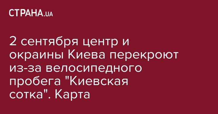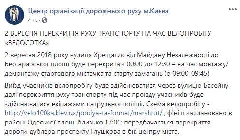 2 сентября 2018 улица Крещатик от Майдана Независимости до Бессарабской площади будет перекрыта с 00:00 до 12:30 - на время монтажа / демонтажа стартового городка и старта соревнований "Киевская сотка". Об этом сообщает Центр организации дорожного движения "Выезд участников велопробега будет осуществляться через улицу Бассейная, дальше перекрытия движения транспорта во время проезда участников будет осуществляться экипажами патрульной полиции. Финиш запланирован в районе Одесской площади около 17:00, предусматривается перекрытие дороги-дублера проспекта Глушкова в сторону центра города", - говорится в сообщении.