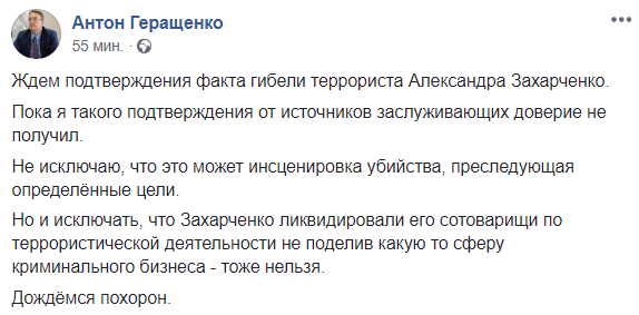"Ждем подтверждения факта гибели террориста Александра Захарченко.
