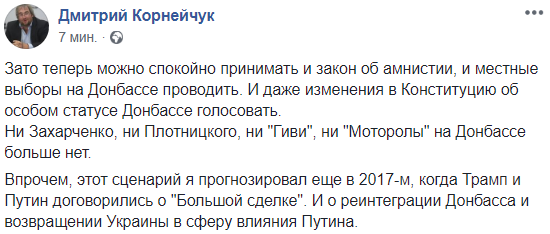 Впрочем, этот сценарий я прогнозировал еще в 2017-м, когда Трамп и Путин договорились о "Большой сделке". И о реинтеграции Донбасса и возвращении Украины в сферу влияния Путина".