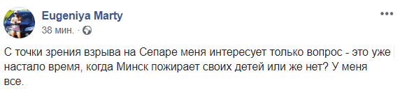 19:02  "С точки зрения взрыва на "Сепаре" меня интересует только вопрос – это уже настало время, когда Минск пожирает своих детей, или же нет?" – пишет в Facebook дончанка Евгения Мартынова.