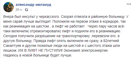 Совладелец ТРЦ Dream Town Александр Меламуд написал, что скорая увезла Давида Черкасского в районную больницу, где его оставили лежать в коридоре на первом этаже, поскольку отделение реанимации там на шестом, а лифт не работал. Через пару часов лифт все-таки включили и режиссера доставили в реанимацию. 2 сентября удалось получить разрешение на транспортировку и Давида Черкасского перевезли в другую больницу. При этом в райбольнице вновь возникли проблемы с лифтом. И 82-летний художник Радна Сахалуев, нарисовавший капитана Врунгеля и придумавший пиратов из "Острова сокровищ", вместе с другими пожилыми посетителями, вынужден был пешком подниматься и спускаться с шестого этажа.