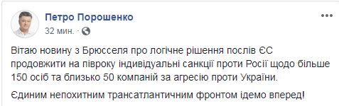 "Приветствую новость из Брюсселя о логичном решении послов ЕС продлить на полгода индивидуальные санкции против России относительно более 150 человек и около 50 компаний за агрессию против Украины", - написал он. "Единым непоколебимым трансатлантическим фронтом идем вперед!", - добавил президент.