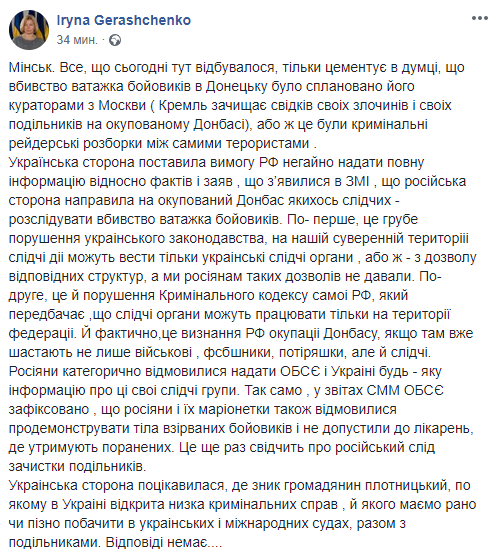 В Украине потребовали Россию предоставить полную информацию о прозвучавших заявлениях об отправке следователей ФСБ в Донецк с целью поиска убийц Захарченко. Об этом сообщила первый вице-спикер Верховной Рады Ирина Геращенко на своей странице в Facebook.