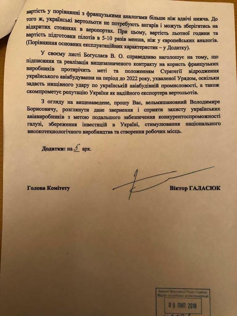 По этой причине Галасюк считает, что подписание и реализация контракта между правительствами двух стран на выдачу Украине 475 млн. евро кредитных средств на приобретение указанных вертолетов, противоречит Стратегии возрождения украинского авиастроения до 2022 года, а также наносит имиджевый удар Украине как экспортеру своих вертолетов.