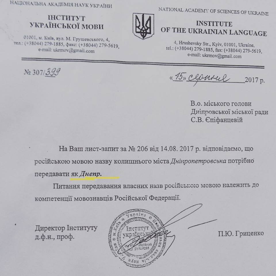 Название переименованного из Днепропетровска в Днепр по-русски следует писать и читать как "Днепр". Об этом сказано в письме-ответе Института украинского языка, подписанного директором института Павлом Гриценко на запрос чиновников горсовета Днепра. Документ разместила у себя на Facebook главред КП в Украине Оксана Богданова.