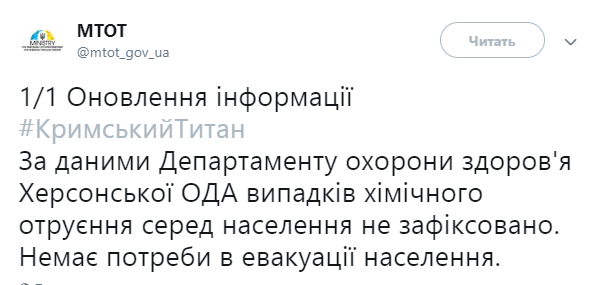 В Херсонской области не зафиксированы случаи химического отравления из-за выбросов химикатов в Крыму. Об этом в Twitter МинВОТ со ссылкой на данные Департамента здравоохранения Херсонской ОГА.