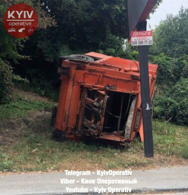 Киевляне обратили внимание на перевернутый мусоровоз по проспекту Науки. Фото