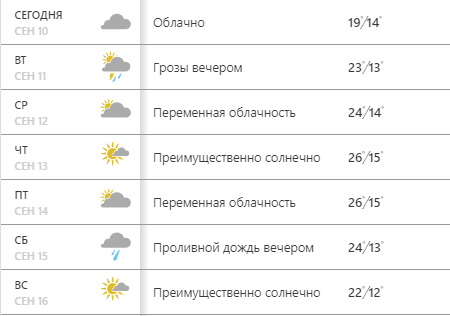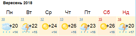 Ресурс Мeteoprog.ua прогнозирует дождь 10 и 11 сентября и температуру до +20. Затем установится сухая погода, потеплеет до +26...+27. Однако с воскресенья температура снизится до +21.