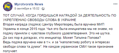 Напомним, о получении очередной "подяки" сообщалось на странице "Миротворца" в Facebook. В сообщении говорится, что сайт получил уже вторую по счету награду от МИП "за настойчивую работу в интересах свободы слова и мысли". Инициатором вручения награды здесь называли Татьяну Попову.