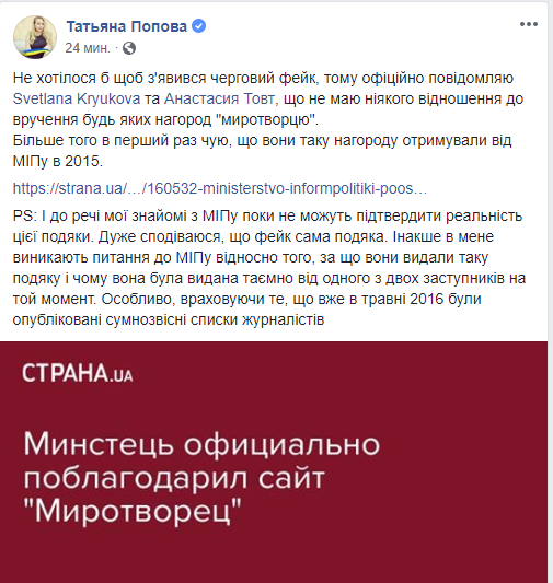 Позже эту информацию прокомментировала и сама Татьяна Попова, которая на момент выдачи этой благодарности была заместителем министра информационной политики Украины и выступала категорически против деятельности "Миротворца".