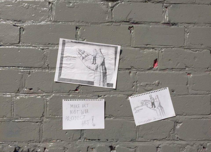 В какой-то момент на закрашенную стену приклеили бумажные листовки с изображением первоначального граффити и лозунгом "Make art not war" (Занимайтесь искусством, а не войной).