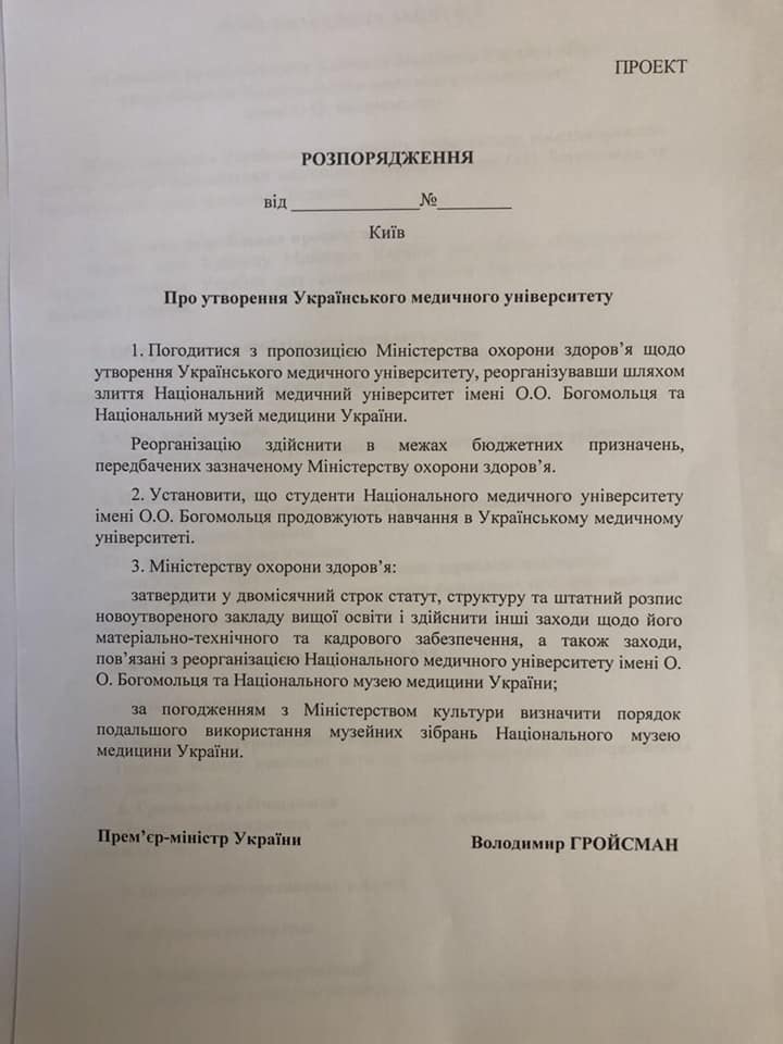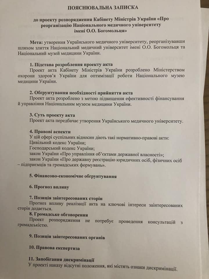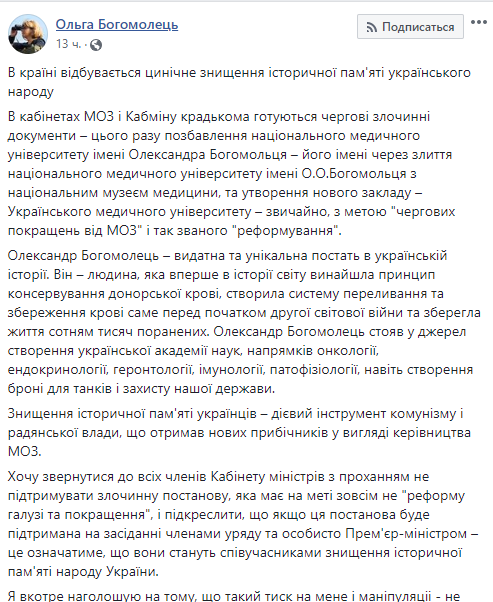 Народный депутат Ольга Богомолец на своей странице в Fаcebook написала, что Минздрав и Кабмин хотят лишить национальный медицинский университет имени Александра Богомольца  его имени из-за слияния с национальным музеем медицины. Таким образом будет образован Украинский медицинский университет, который уже не сможет носить имя Богомольца.