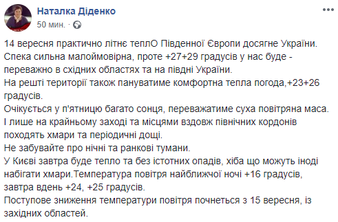 В Украину в пятницу, 14 сентября, придет летнее тепло южной Европы с маловероятной жарой, но комфортными +27...+29 градусов в восточных и южных областях. Об этом сообщает синоптик Наталья Диденко на своей странице в Facebook.