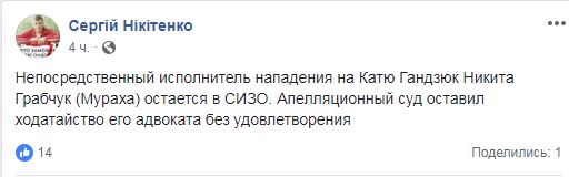 Также 13 сентября уже состоялось апелляционные заседания относительно еще двоих фигурантов дела: Сергея Торбина и Никита Грабчука (позывной "Мураха", его называют непосредственным исполнителем нападения - Прим. Ред.). По результатам заседаний суд решил оставить Грабчука и Торбина в СИЗО.