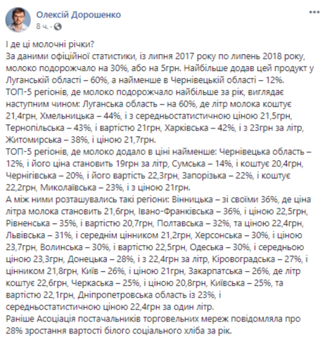 "ТОП-5 регионов, где молоко подорожало больше всего за год, выглядит следующим образом: Луганская область - на 60%, где литр молока стоит 21,4 грн, Хмельницкая - 44%, со среднестатистической ценой 21,5 грн, Тернопольская - 43%, и стоимостью 21 грн, Харьковская - 42%, и с 23 грн за литр, Житомирская - 38%, и ценой 21,7 грн", - написал Дорошенко.