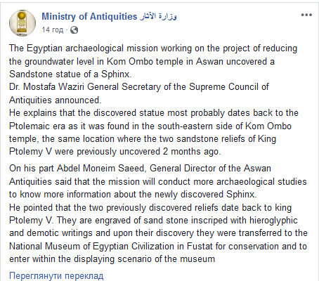 В Египте археологи совершили очередное знаковое открытие. Здесь, в ходе работ по откачке грунтовых вод из-под храма Ком-Омбо в районе города Асуан на юге страны обнаружили нового Сфинкса - статую животного с лицом человека. Об этом сообщает египетское министерство по делам древностей в Faсebook.