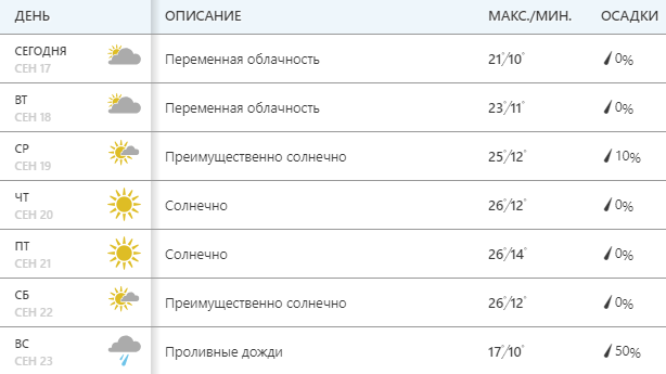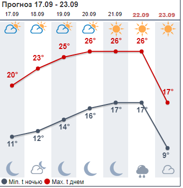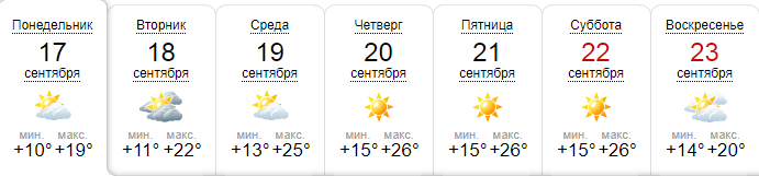 Сайт Gismeteо обещает солнечную неделю. В начале недели термометры покажут +18...+20 днем, затем до +24...+26. В воскресенье температура снизится до +22. С 24 сентября этот сайт обещает дожди и снижение температуры.
