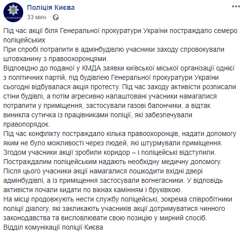 Сегодня, 17 сентября, при штурме Генпрокуратуры в Киеве пострадали по меньшей мере семь полицейских. Об этом сообщает пресс-служба полиции Киева в Facebook.