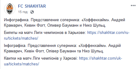 Накануне поединка официальный сайт "горняков" на своей странице в Facebook в яркой инфогафике представил четверку лидеров немецкого клуба - Андрея Крамарича, Кевина Фогта, Оливера Бауманна и Нико Шульца.