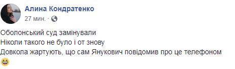 "Оболонский суд заминировали. Никогда такого не было и вот опять. Вокруг шутят, что сам Янукович сообщил об этом по телефону", - написала она.