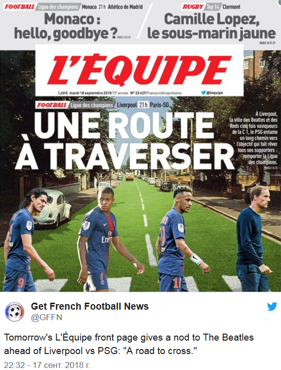 Лига чемпионов, Ливерпуль - ПСЖ. L'Équipe показала как французы переходят дорогу в стиле The Beatles