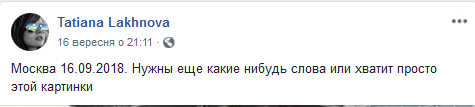 Так, например, пользователь Татьяна Лахова разместила в Facebook такое фото и снабдила его комментарием: "Москва 16.09.2018. Нужны еще какие нибудь слова или хватит просто этой картинки?".
