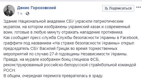 "Как сообщает пресс-служба Службы безопасности Украины в Facebook, граффити под названием "На страже безопасности Украины" открыл председатель СБУ Василий Грицак во время торжественных мероприятий по случаю 27-й годовщины Независимости Украины. Правда, на мурале изображен боец спецназа ФСБ, реконструированный российско-белорусской страйкбольной командой РОСН", - сообщает Гороховский. И резюмирует: "В общем, очередная "перемога" превратилась в "зраду". Гороховский также приводит фото мурала и изображение бойца ФСБ.