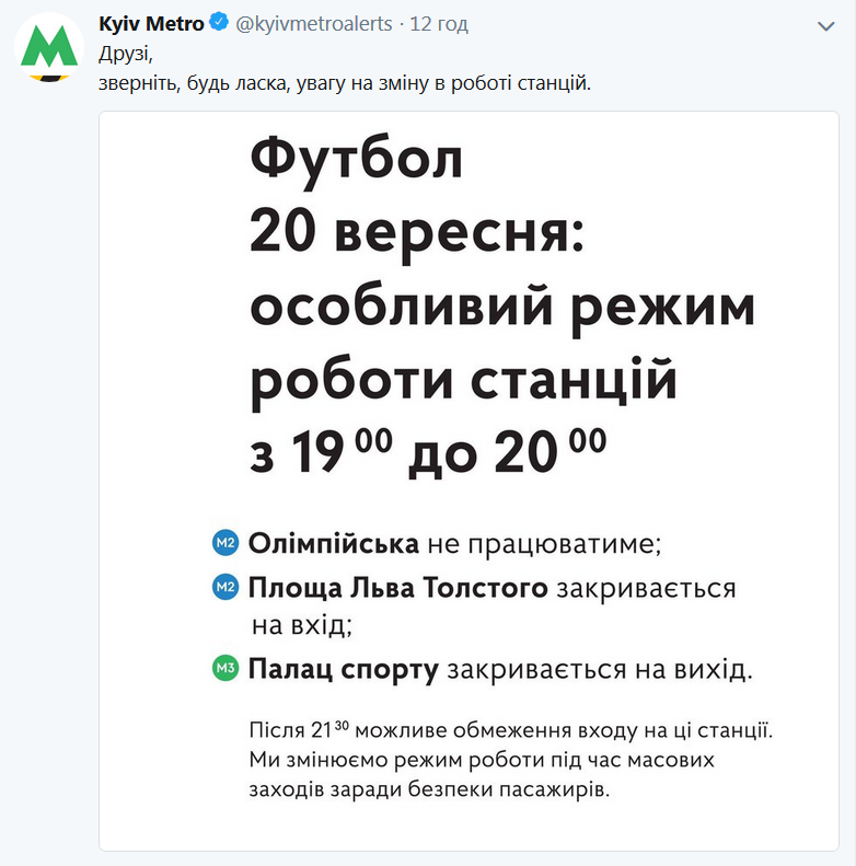 Обратите, пожалуйста, внимание на изменение в работе станций. Футбол: 20 сентября особый режим работы станций с 19:00 до 20:00", - уточнили в прес-службе.