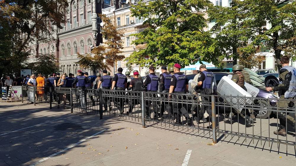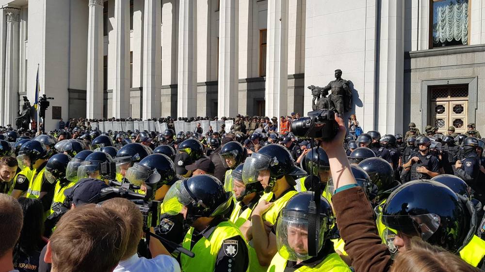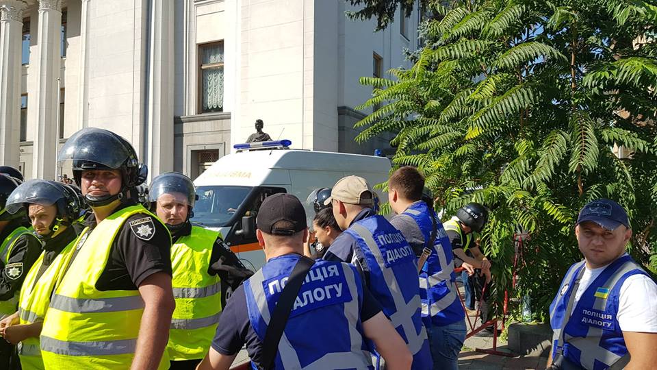 11:47  Под Радой начались столкновения. Активисты Нацкорпуса перелезли через забор и начали раздавать свои листовки полиции. Их попросили покинуть территорию, но они отказались. У одного из правоохранителей травма ноги, его увели под руки. Активисты снесли забор и использовали петарды.