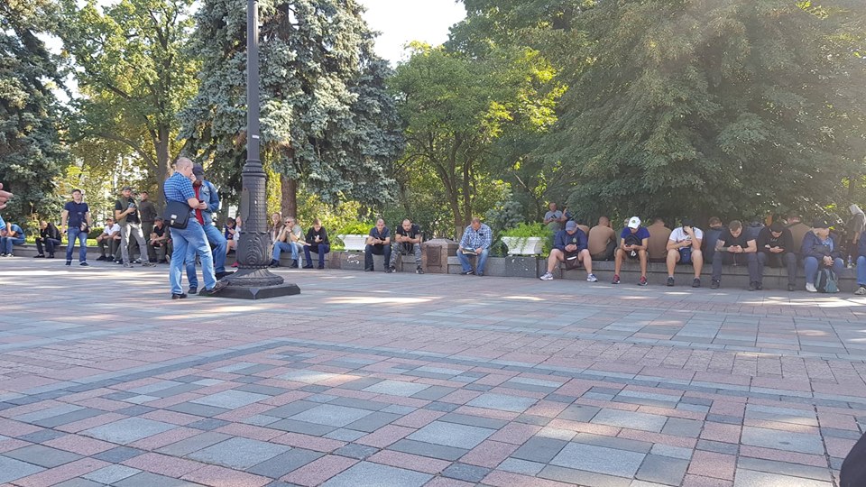 12:40 Протестующие начинают постепенно стягиваться под Верховную Раду с обеда. Несколько человек в рядах "Нацкорпуса" в балаклавах, кто-то в руках держит деревянные палки.