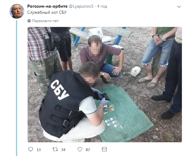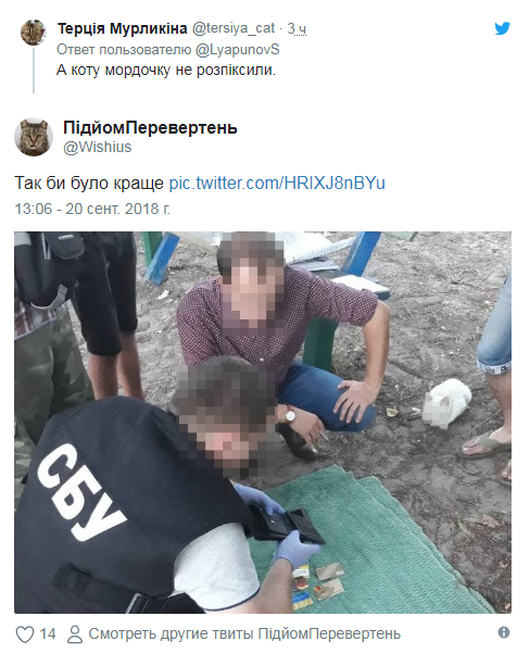 В сети обратили внимание на фото, опубликованное 18 сентября в аккаунте Службы безопасности Украины в Facebook. На ней один из мужчин в форме спецслужбы, изучал чье-то портмоне. Перед ним также были разложены банковские карты и пакетики с чем-то. Напротив удобно расположился кот, наблюдающий за происходящим.