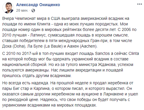 В этом году Всемирные конные игры, которые проходили с 10 по 23 сентября в США, выиграл американский всадник на лошади по кличке Клинта. Скакун принадлежал народному депутату и коневоду Александру Онищенко, который сделал безлошадной сборную Украины по конкуру. Об этом он сообщил на своей странице в Facebook.