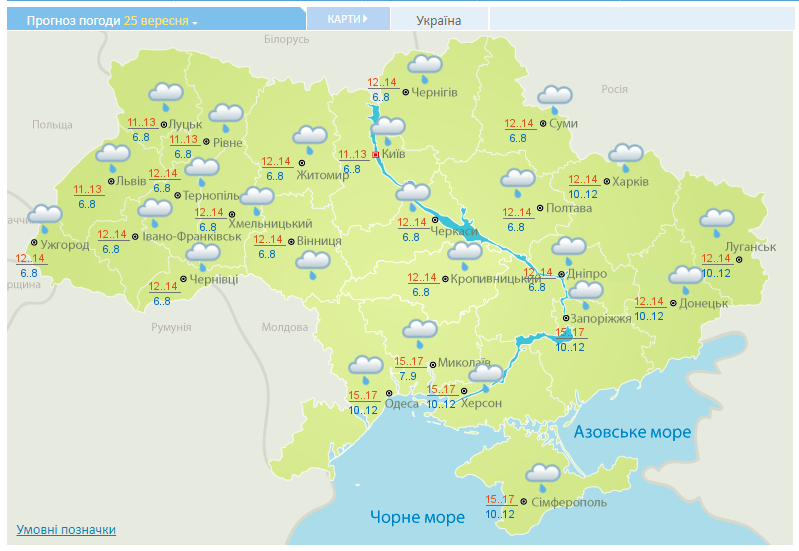 Синоптики отмечают, что ночью в западных, большинстве северных и Винницкой областях, днем в Украине дожди, местами, кроме юго-востока, сильные дожди. Температура воздуха ночью 6-11°. Днем в западных и северных областях 12-17°, на остальной территории 18-23°.