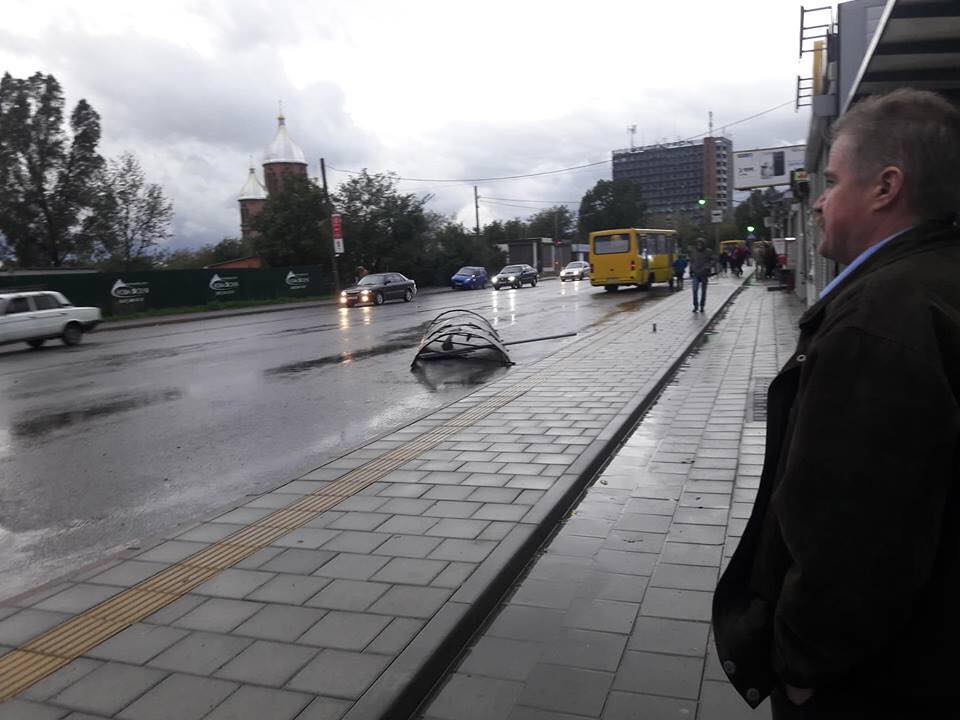 "Ветер сносит конструкции - будьте осторожны. 7:45 Остановка на ул. Луганской у "Кредобанка". Оторвалась боковая защита. Острые края. Будьте внимательны", - говорится в заметке. В других частях Львова также повреждены некоторые объекты.