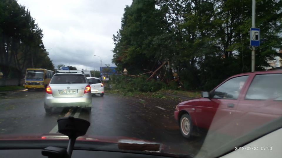 Также по словам Зинкевича, на улице Липинского у ГСО упало дерево. "Первая полоса занята, провода оборваны. Только что произошло", - написал он.