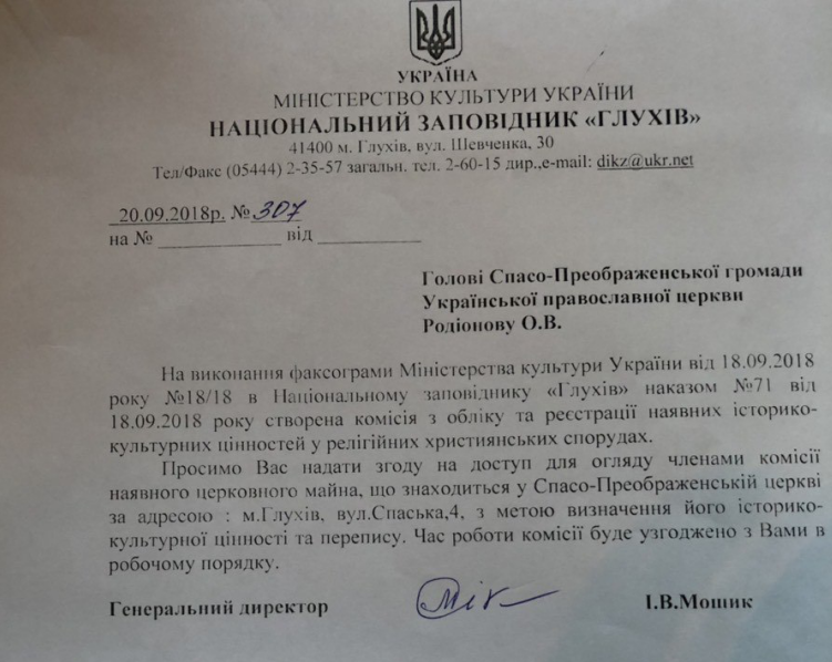 В министерстве культуры Украины издали приказ о проверке Спасо-Преображенской церкви УПЦ МП в Глухове на предмет ценностей. Храм в ходит в историко-культурный заповедник "Глухов".