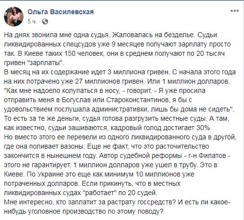 "На днях звонила мне одна судья. Жаловалась на безделье. Судьи ликвидированных спецсудов уже 9 месяцев получают зарплату просто так. В Киеве таких 150 человек, они в среднем получают по 20 тысяч гривен "зарплаты". В месяц на их содержание идет 3 миллиона гривен. С начала этого года на них потрачено уже 27 миллионов гривен. Или 1 миллион долларов", - написала журналистка.