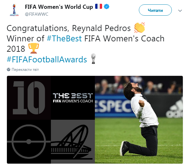 На церемонии The Best FIFA Football Awards в Лондоне назвали лучшего тренера в женском футболе. Им стал наставник футболисток французского "Лиона" Рейнальд Педрос.