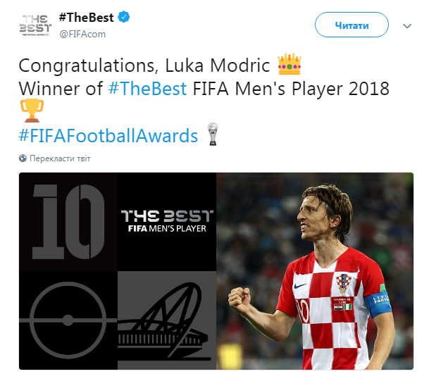 В понедельник, 24 сентября, на церемонии The Best FIFA Football Awards лучшим футболистом минувшего сезона признан победитель Лиги Чемпионов в составе мадридского "Реала" и финалист ЧМ-2018 в составе сборной Хорватии Лука Модрич.