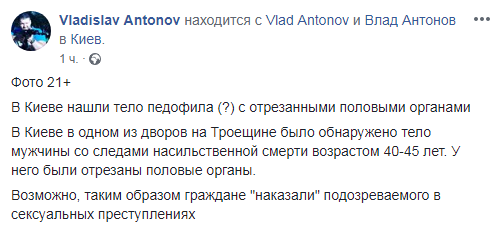 По его словам, убитому на вид 40-45 лет. Его обнаружили в одном из дворов на Троещине. Автор поста предполагает, что мужчину убили и отрезали половые органы, так как он был подозреваемым в сексуальных преступлениях. Возможно, - педофилии. Однако данная информация не подтверждена.