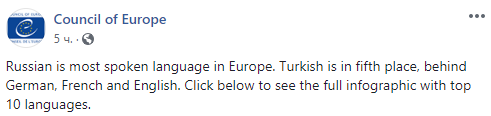 Русский, немецкий и французский - наиболее широко употребляемые языки среди населения Европы. Такие данные приводит Совет Европы в Facebook по случаю Европейского дня языков, который отмечают 26 сентября. Украинский же занял почетное 8 место.